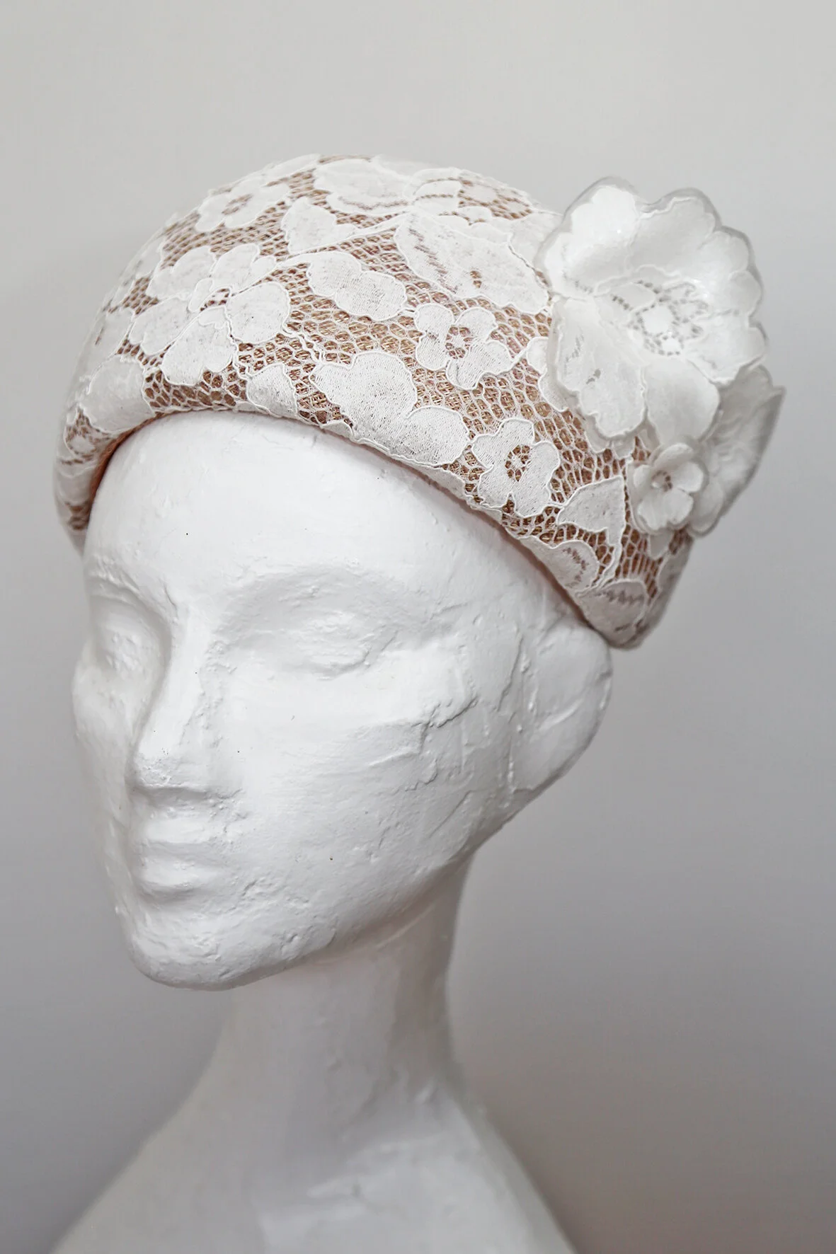 Blush sinamay headband with ivory lace overlay, trimmed with embedded lace flowers.